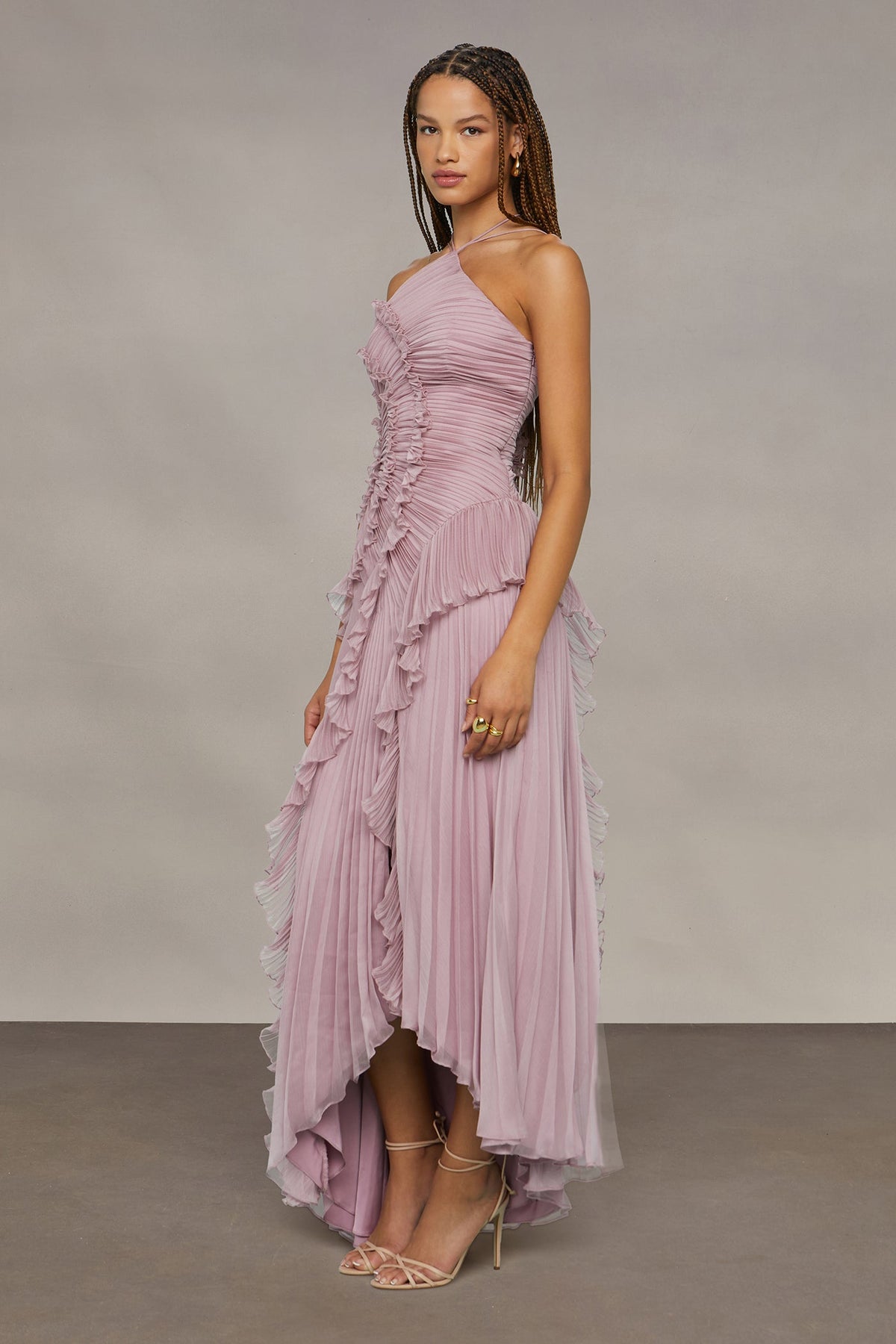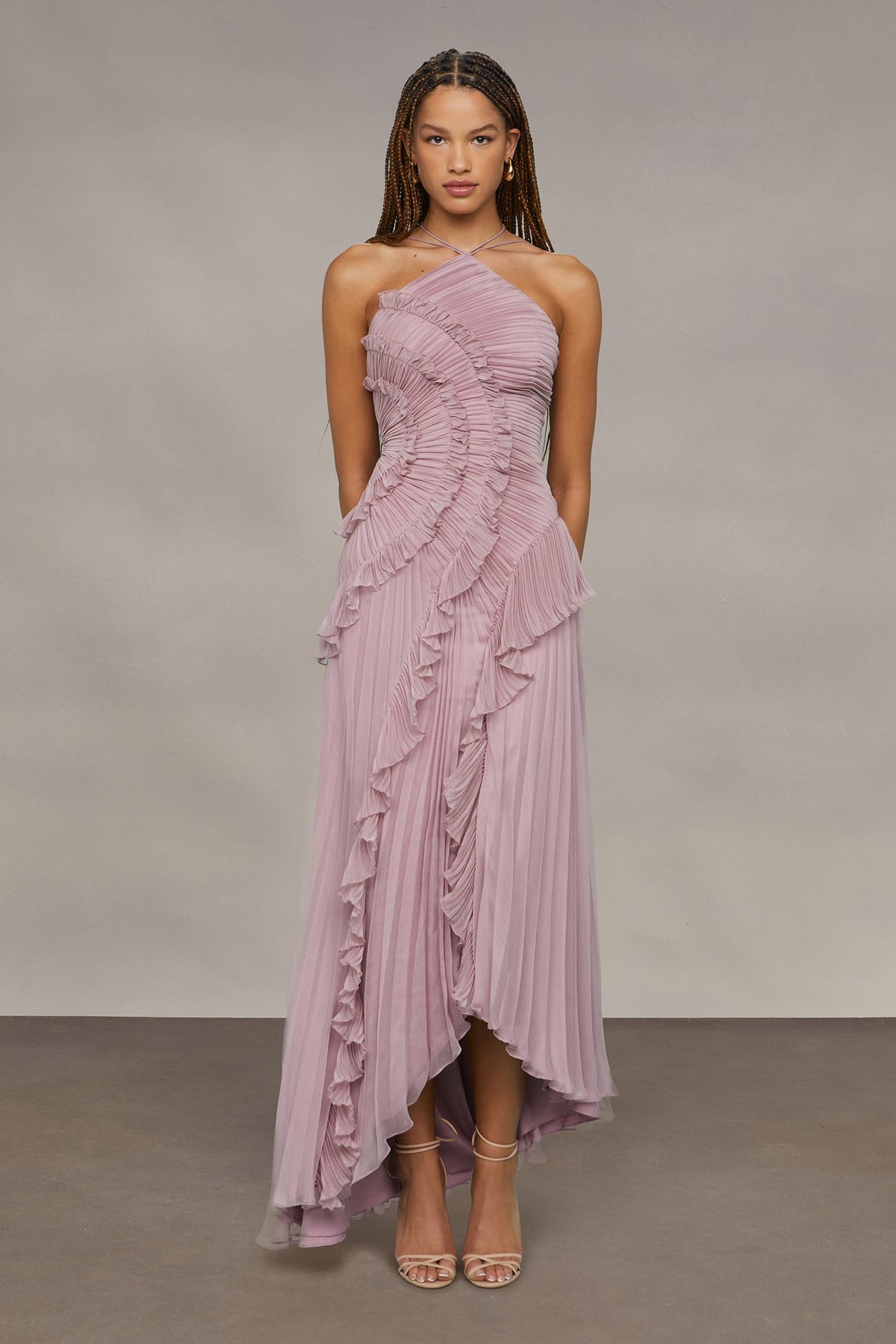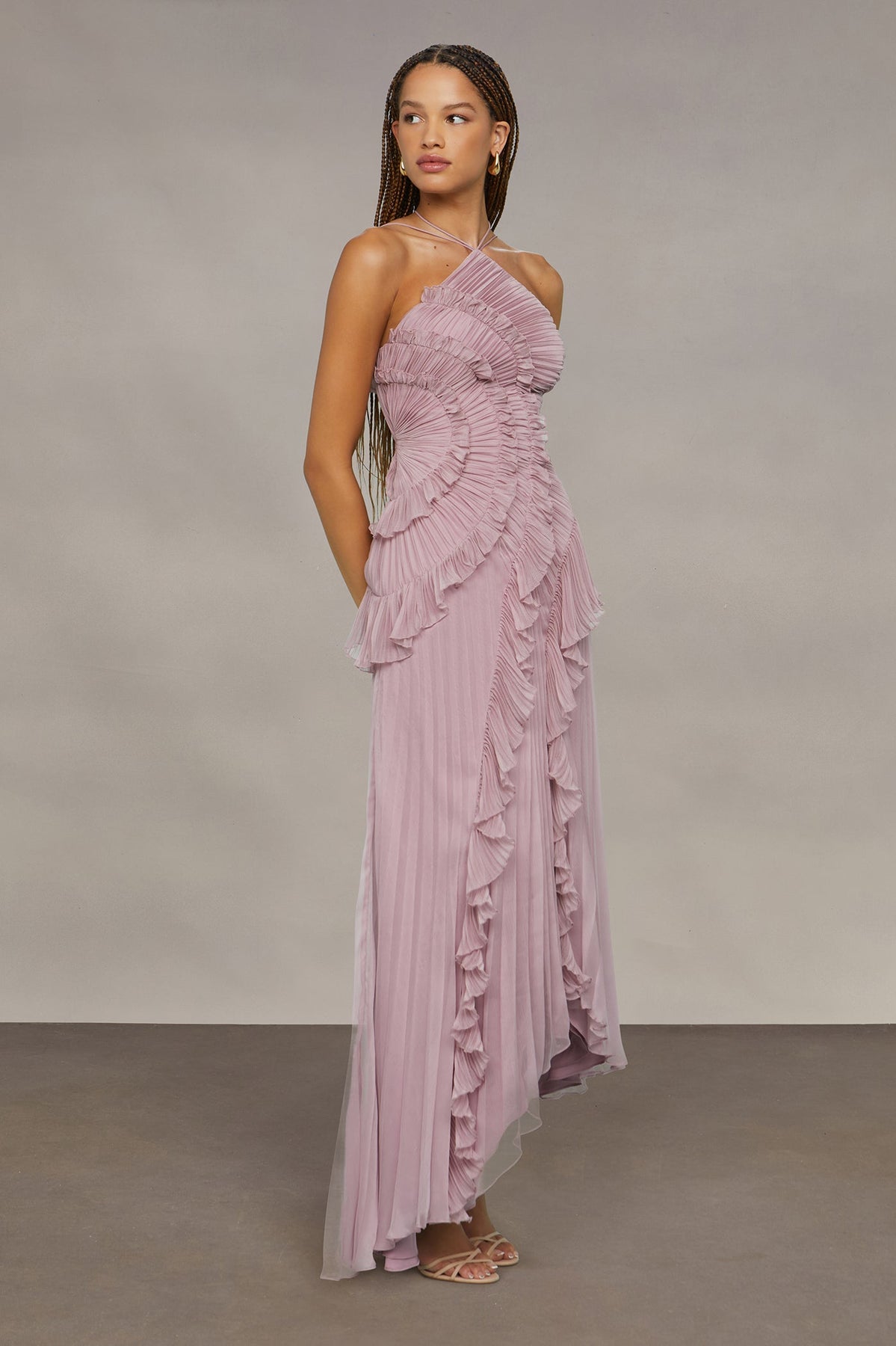 Made from premium pleated chiffon with soft ruffle detailing throughout. Designed with an asymmetric halter neckline and a flowing high-low hemline for an elegant, feminine silhouette. Fully lined.