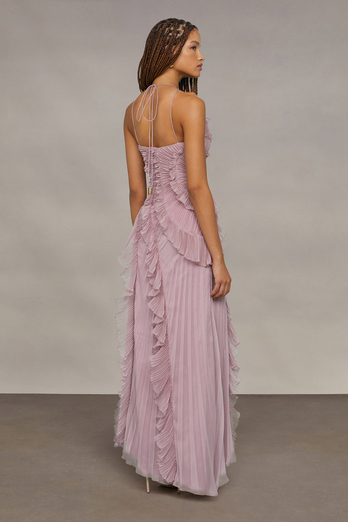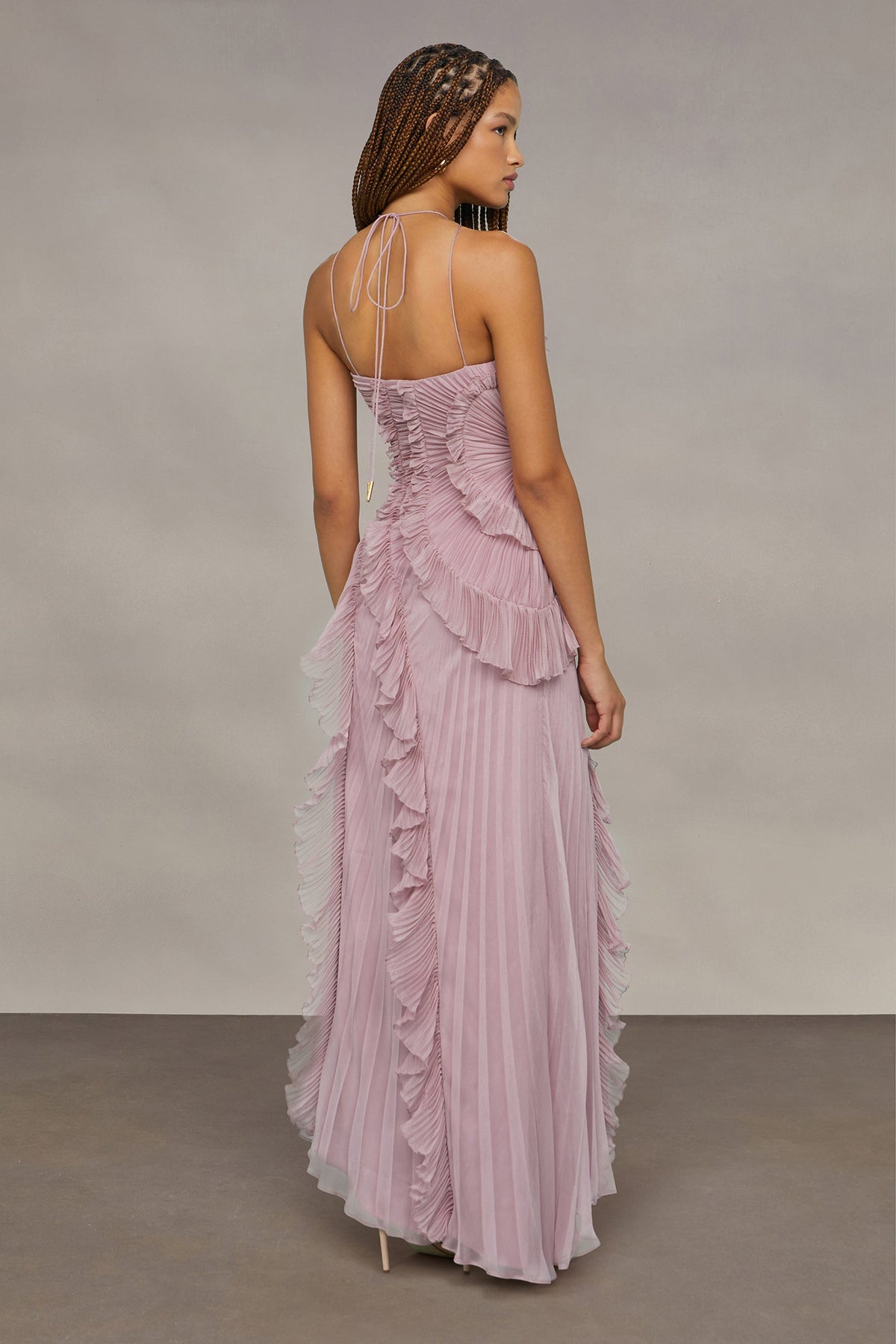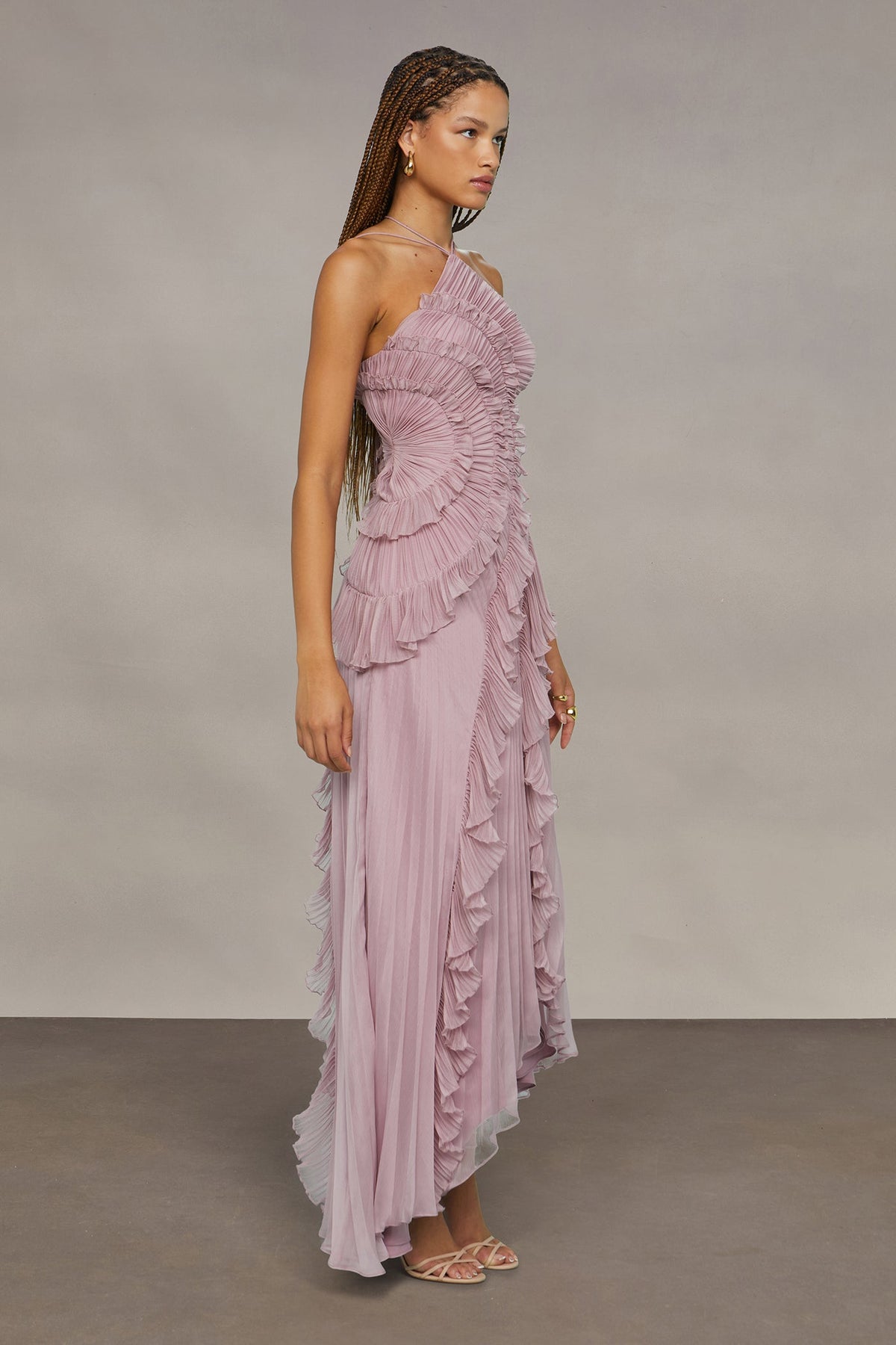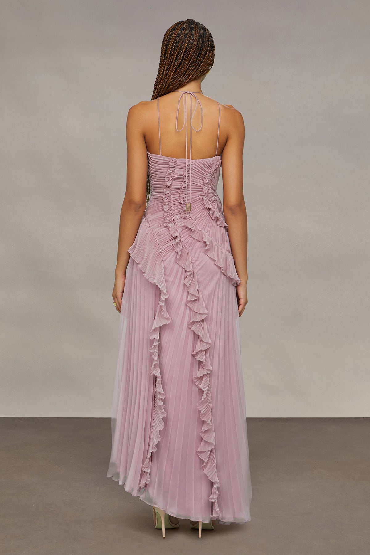 Made from premium pleated chiffon with soft ruffle detailing throughout. Designed with an asymmetric halter neckline and a flowing high-low hemline for an elegant, feminine silhouette. Fully lined.